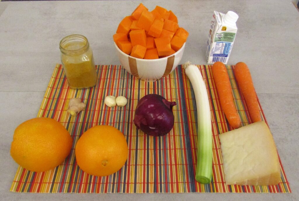 En una cazuela ponemos a pochar el ajo, el jengibre, las zanahoria, la cebolla y el puerro cortado en trozos no muy grandes. Cuando estén dorados añadimos la calabaza pelada y cotada en trozos pequeños. Dejamos pochar un rato, salpimentamos y añadimos el curry y un poco de pimentón picante. Mezclamos y dejamos tostar un poco el curry antes de incorporar el zumo de naranja. Echamos un poco de agua hasta cubrir por completo y dejamos cocer 30 minutos.